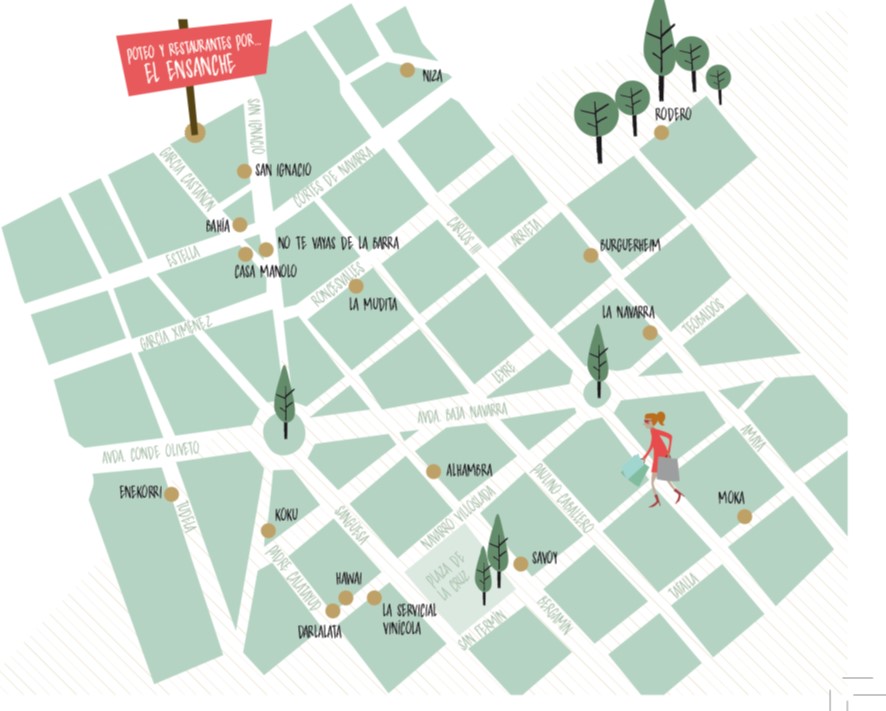 La Barra del Goloso (Aoiz 12). El Ensanche se está transformando en la segunda opción del ocio en la ciudad, siendo capaz de atraer a un público variopinto que acaba en el Goloso. Desde su inauguración en 2010, este bar de moderno interiorismo y estudiada iluminación ha seducido no solo por su barra, una de las más atractivas de la ciudad, sino por su gastronomía basada en especialidades a la parrilla en el primer horno Jasper instalado